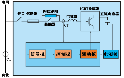 直流電容器為儲能元件并通過IGBT逆變器和接口電抗器電網輸出補償電流;直流電容同時通過電源板為信號板、控制板和驅動板提供工作電源。