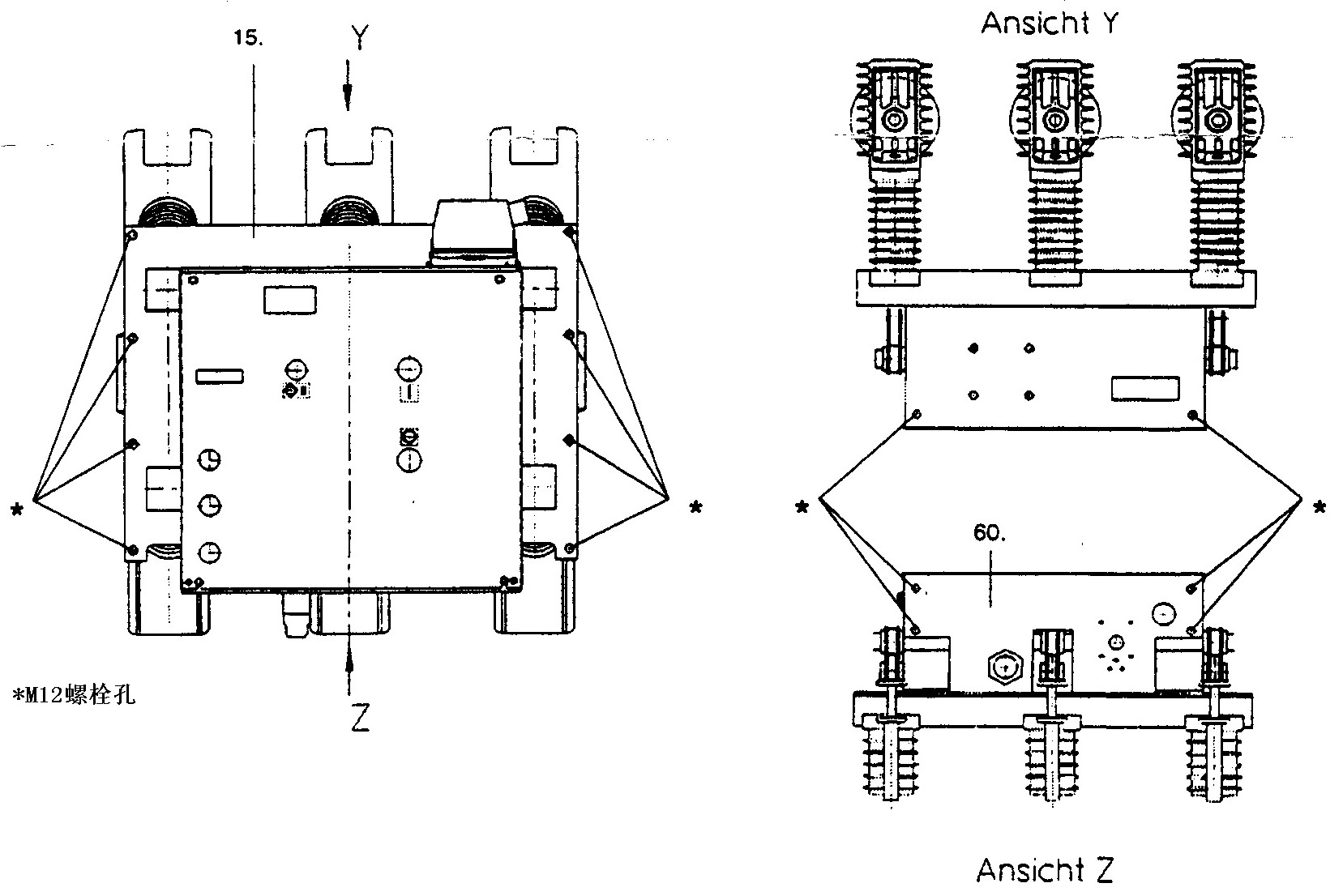 使用連接到機(jī)械柜(60.)邊的帶有適當(dāng)標(biāo)志的M12端子(70.)上(見圖3/3)的扁銅,銅纜或鍍鋅鋼帶(DIN VDE 0141/7.76 項目5.3),把源創(chuàng)電氣真空斷路器連接到專用的高壓保護(hù)接地