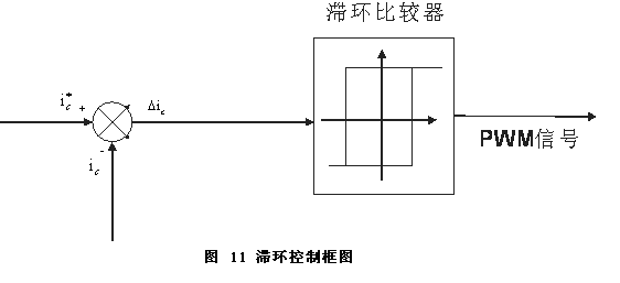 此類控制器中滯環(huán)比較器由于產(chǎn)生的補(bǔ)償電流參考信號能夠快速準(zhǔn)確地跟蹤諧波電流變化,具有很好的實(shí)時(shí)性,所以在有源濾波器中得到了廣泛的應(yīng)用。滯環(huán)比較器的控制框圖如圖11所示。