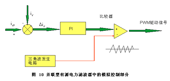 圖10給出了在并聯(lián)型有源電力濾波器中經(jīng)常采用的一種數(shù)字模擬混合控制器的模擬部分。其中參考電流信號由微處理器通過D/A轉(zhuǎn)換變成模擬信號送到模擬控制部分。有源電力濾波器的補(bǔ)償電流與參考電流進(jìn)行比較,通過比例積分環(huán)節(jié)后成為調(diào)整信號,與三角波發(fā)生電路產(chǎn)生的作為載波信號的三角波進(jìn)行比較,獲得驅(qū)動(dòng)有源濾波器逆變器的PWM驅(qū)動(dòng)脈沖。